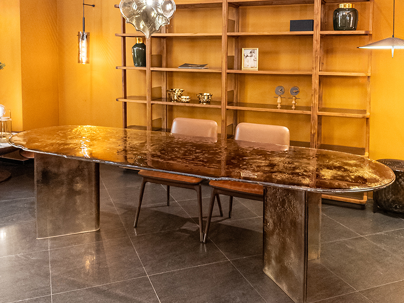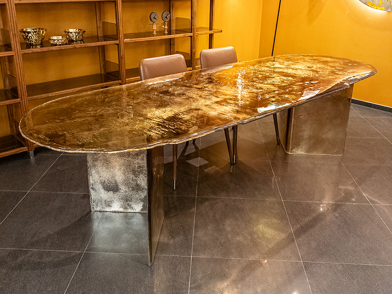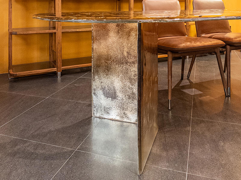 Обеденный стол Bisatello из коллекции MELT выполнен из двухслойного стекла и благодаря наличию цветных вуалей и серебристых отблесков с эффектом живой воды, передает эстетику окружающего Венецию моря, оживляя предметы интерьера, созданных благодаря мастерству, присущему Arte Veneziana.