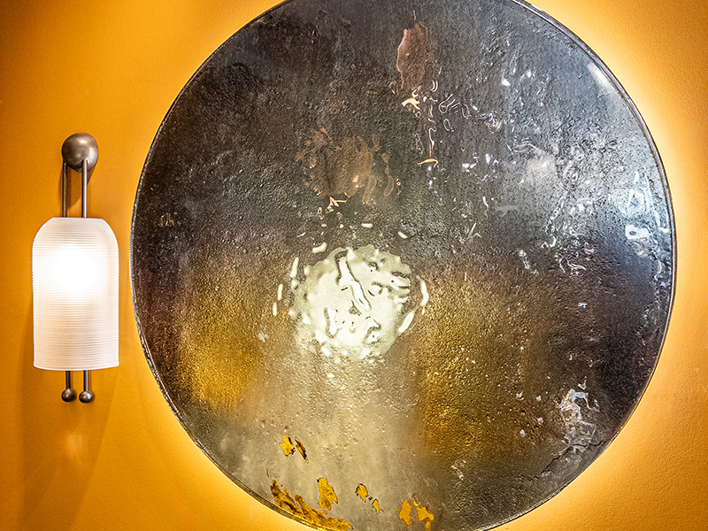 Настенное панно Fiorin, как и все предметы в коллекции MELT, создано дизайнером Leo De Carlo. Панно Fiorin представляет собой двухслойное плавленное стекло с неровными краями. Поверхность отделана "лесным" лаком и посеребрена с обратной стороны под старину. Узкая деревянная рама покрыта черным матовым лаком.