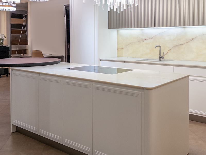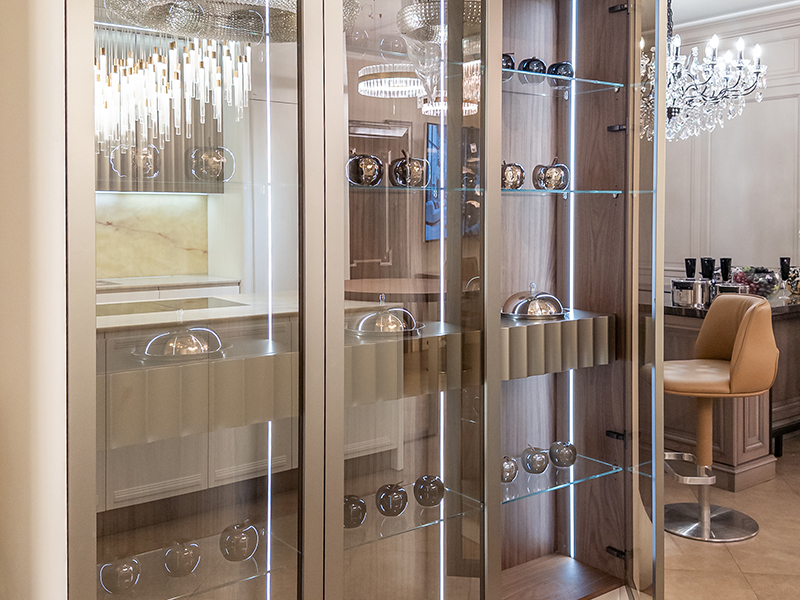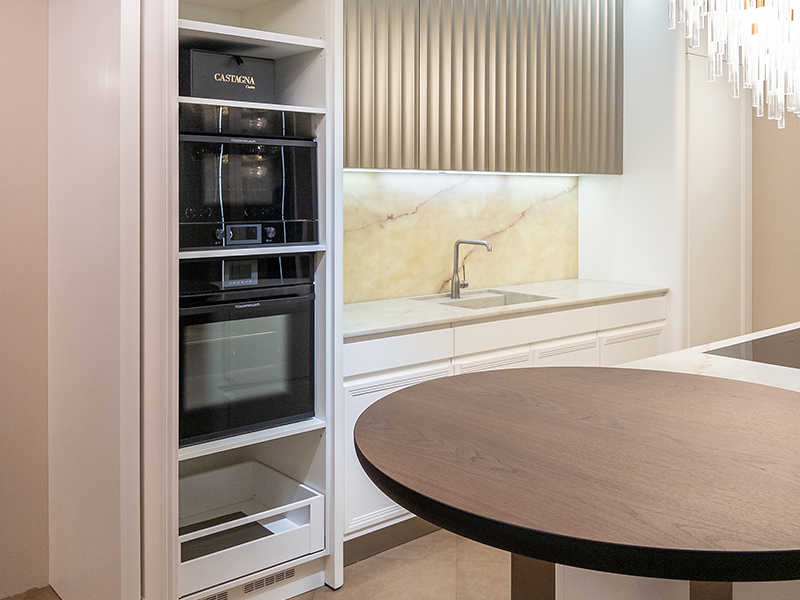 Выполненная по индивидуальному проекту специально для экспозиции Интерьерного салона на площади Победы, кухня Castagna cucine создана со свойственным компании стилистическим вкусом.