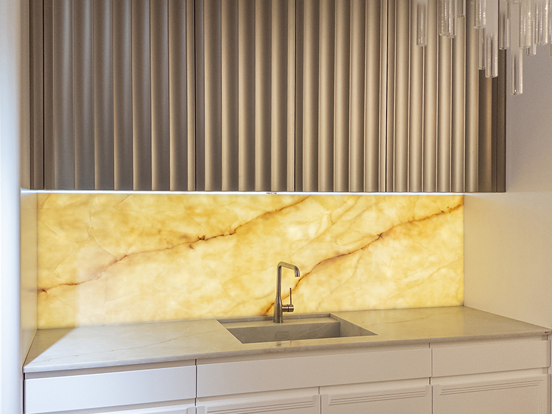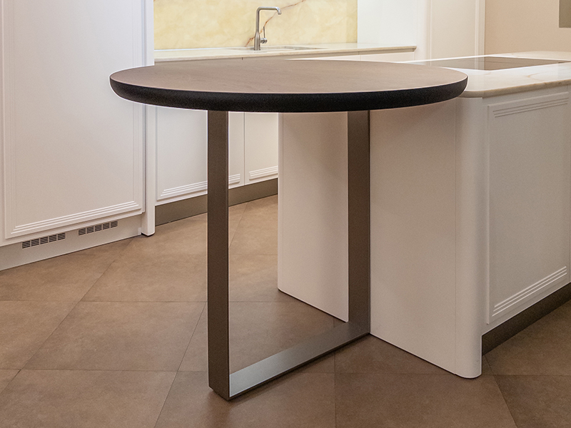 Белоснежные фасады в данной модели сочетаются со стальными элементами - волнообразной панелью колпака вытяжки, цветом отделки буфета. Приставной столик к острову выполнен в отделке шпона "орех каналетто", связующим общий колорит кухни и мраморной столешницы в единое целое.