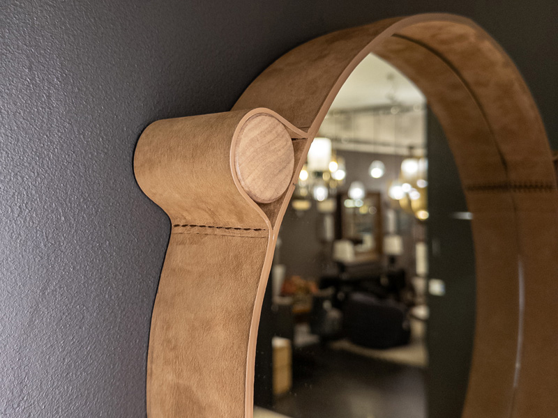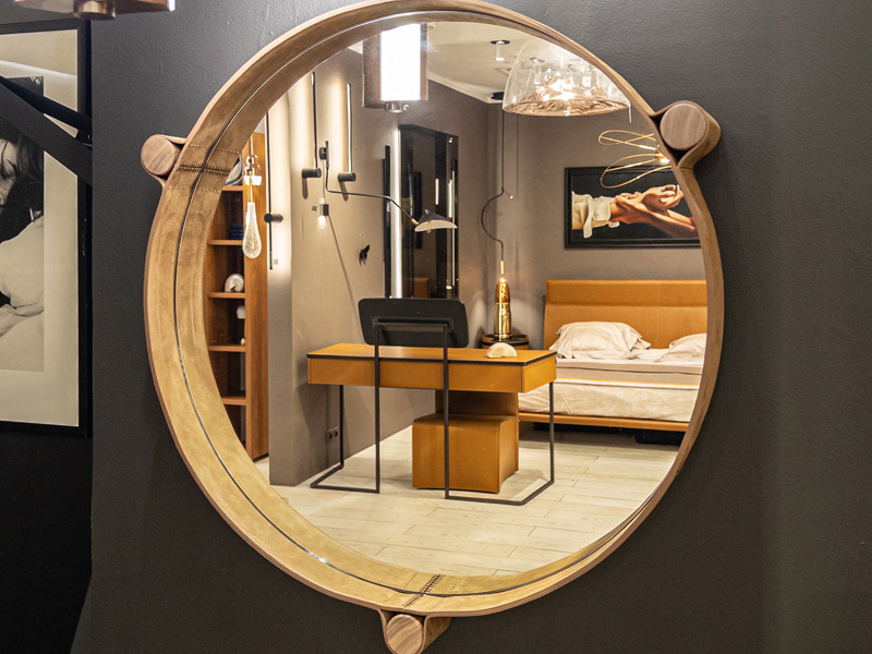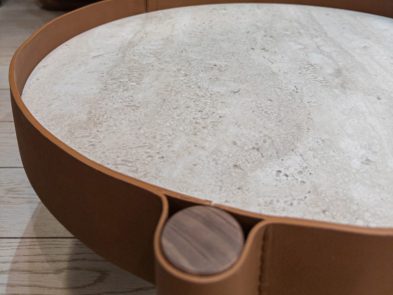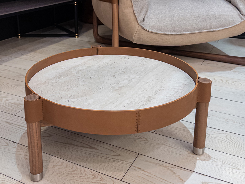 Дополняют экспозицию предметы из серии MIRO для гостиной, в которую входят зеркала и журнальные столики, изготовленные из одинаковых модулей. Творчество начинается с наброска, который всегда делается от руки. Затем следует моделирование и рендеринг, но именно первоначальная концепция в конечном счёте определяет весь процесс разработки. Дизайнер хотел создать аксессуар, который бы отражал суть компании: работу с кожей. Идея родилась во время поездки в Марокко, где широко используются плетёная кожа и шкуры. В этом проекте Марко Фумагалли сохранил только форму, убрав всё лишнее, чтобы оставить только самое необходимое. Полотно столешницы из керамогранита опоясано кожаным ремнём, который может быть изготовлен из разных материалов и иметь различную отделку. Толщина полотна скрыта этим ремнём, который проходит по периметру, а открытая строчка подчёркивает мастерство и опыт компании.